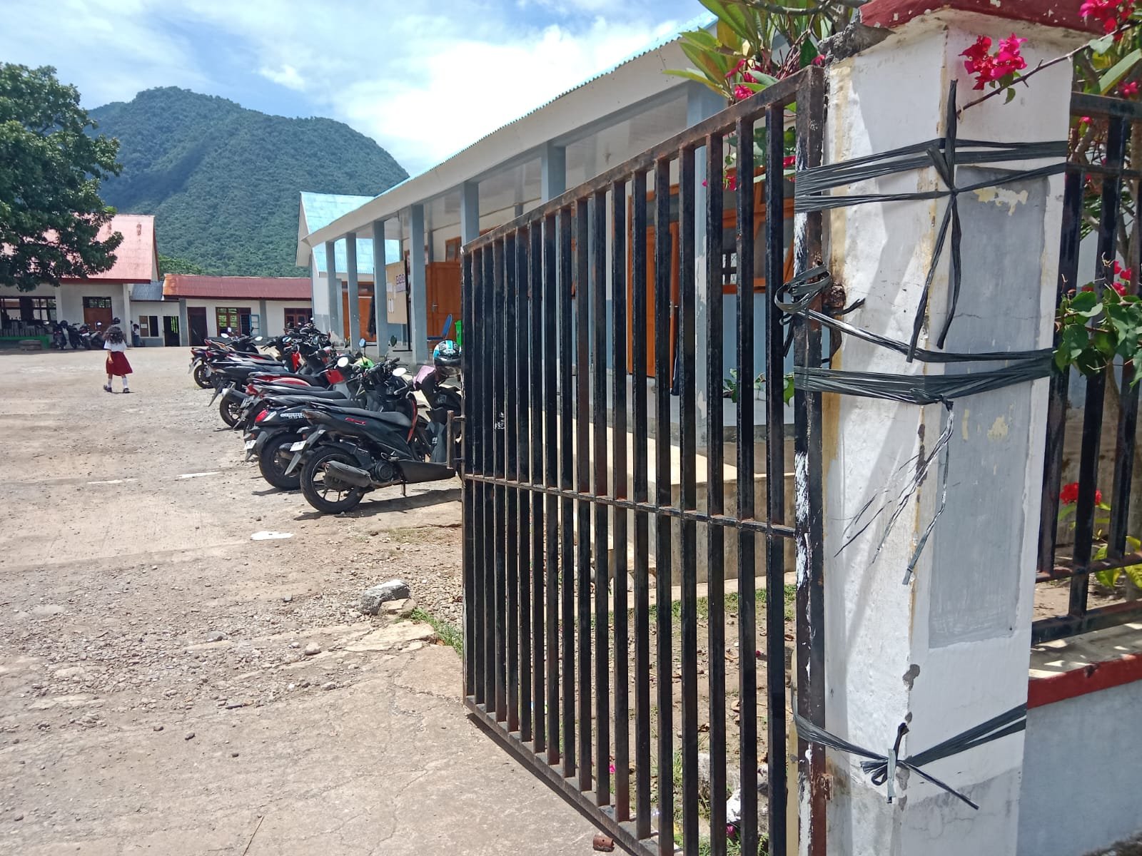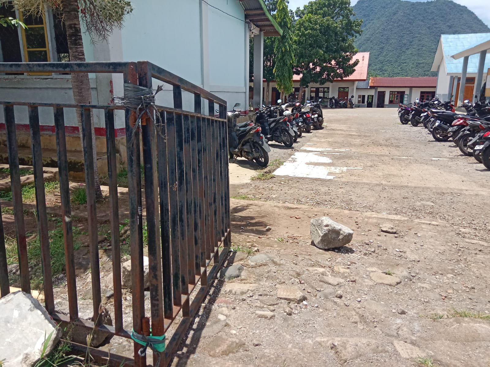 Di depan SMA Swasta Katolik Pancasila Borong, yang terlihat hanyalah beberapa batang besi tua yang disandarkan dan diikat dengan tali rafia. Bekas rangka gerbang lama yang pernah kokoh kini menjadi penutup darurat. Jika angin berembus kencang, ikatannya bergoyang. Jika hujan turun, karat semakin jelas menggerogoti sisa-sisanya.